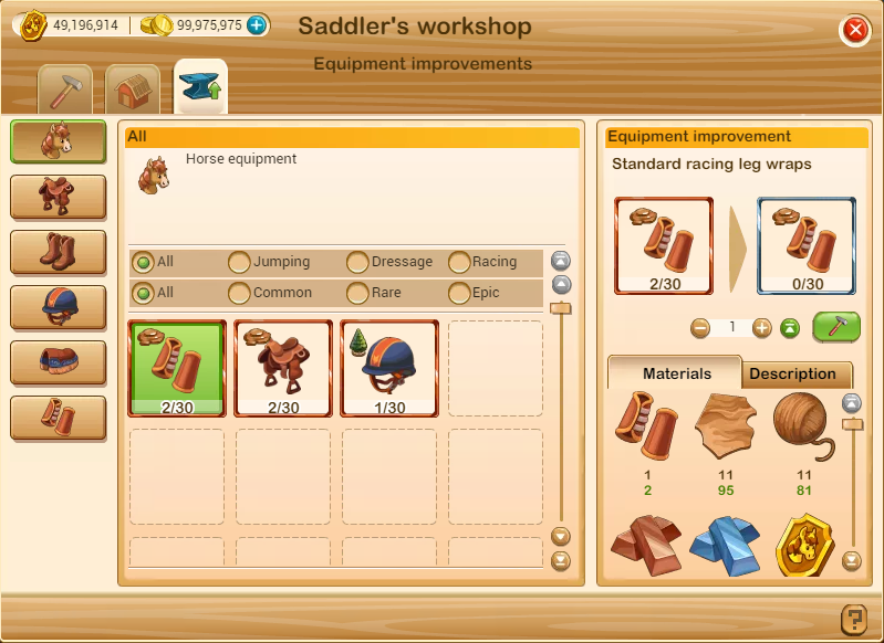 V sedlářské dílně bude nová karta nazvaná Vylepšení vybavení. Zde můžete vyrobit vzácné koňské vybavení pomocí běžného koňského vybavení a dalších požadovaných složek. Špičkové vybavení pro koně má lepší vliv na vlastnosti koně. Karta Vylepšení vybavení bude k dispozici v sedlářské dílně od úrovně 2.