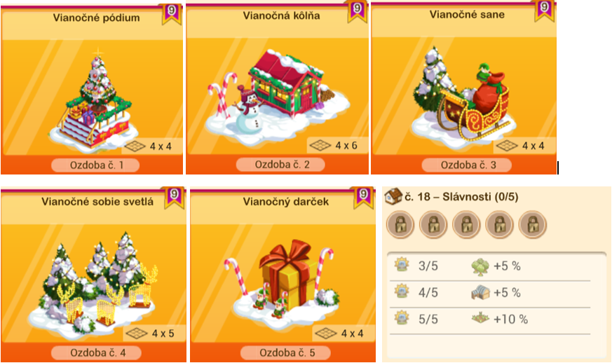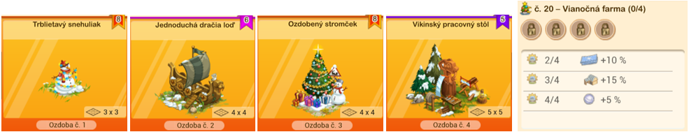 Určená pre Vianočnú dočasnú farmu. Dá sa získať v Ponuke vianočnej farmy za zlato. Ponuky sú 2. V jednej je ozdoba č.1 a 4 spolu s chaluhovými vecami za 14 999 zlata. V druhej už neviem.