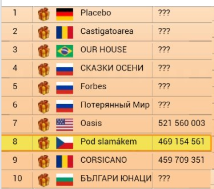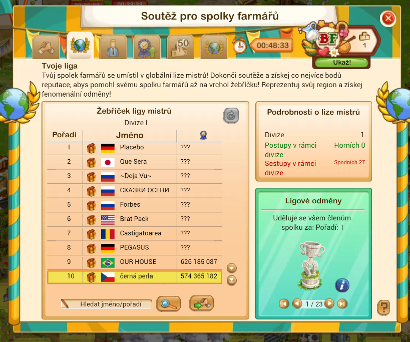 Zdravím všechny hráče.Jelikož jsme nedostali poslední tabulku s konečnými výsledky,,tak jsem zde umístila aspoň nějaké fotky,,aby jste měli přehled o lize mistrů.Moc děkujeme hráčům,kteří nás podporovali a dávali nám štěstíčka na naše farmy.Bylo to od Vás moc milé a dávalo nám to chuť bojovat..Skončili jsme sice až na 10 místě,,,ač jsme nahráli více bodů.Bude to asi stálé těžší a těžší získat lepší umístění. Příště ČR bude zase zastupovat spolek Pod slamákem a my jim přejeme hodně zdaru a štěstí v soutěžích.Děkuji vedoucí spolku Pod slamákem,vždy jsem se na ni mohla obrátit a vždy mi ochotně poradila...