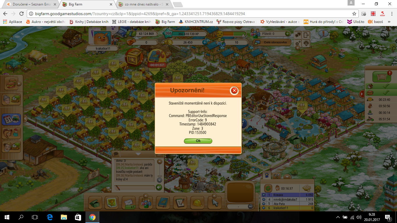 Tak mi to od rána nejde takyblack-.-angel napsal(a):Ahoj, bohužel nikdo jiný tento problém nehlásil, takže bude třeba se obrátit na podporu. Zkus ještě změnit prohlížeč, ale hádám, že to nepomůže.Luci32 (CZ1) napsal(a):Moc děkujiblack-.-angel napsal(a):V nastavení prohlížeče - návod najdeš zde: https://community.goodgamestudios.com/bigfarm/cs/discussion/comment/70862/#Comment_70862.Luci32 (CZ1) napsal(a):Kde se prosím mažou cookies? Ještě jsem nic takového nedělala. Děkuji.black-.-angel napsal(a):Ahoj, zkoušela jsi smazat cookies?Luci32 (CZ1) napsal(a):Ahoj, ode dneška mi nejdou vylepšovat stavby a ani stavět cokoliv nového. Kliknu třeba na pole, chci ho vylepšit na úroveň 3 a hodí mi to error s hláškou, že staveniště není momentálně k dispozici. Přitom nic nestavím. Ještě včera vylepšování staveb fungovalo. Co s tím?