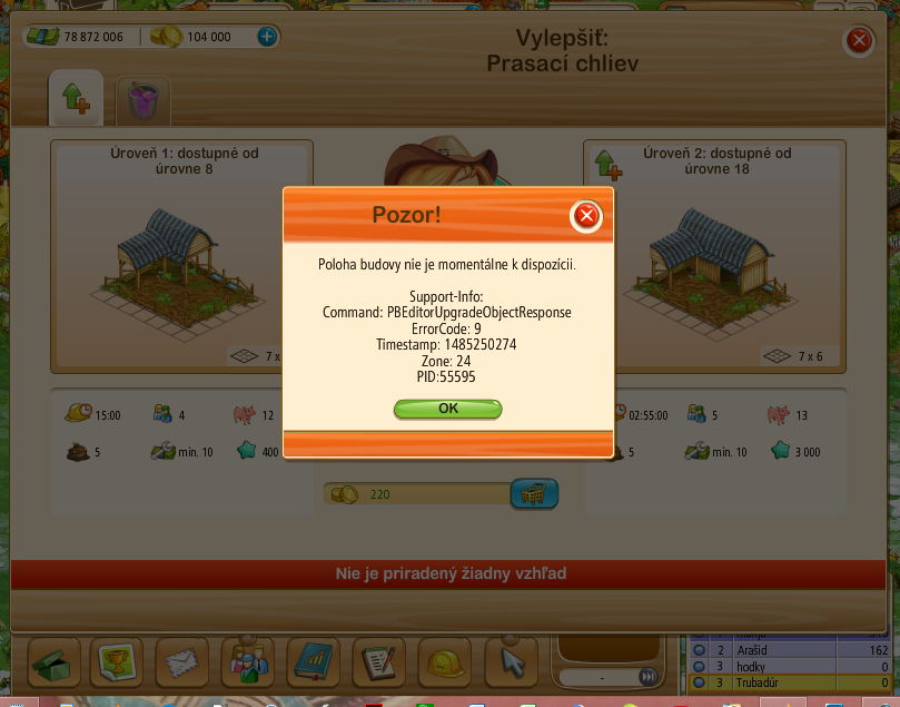 Ďalším problémom je chybové hlásenie pri prechode medzi farmami. Je na štvrtom obrázku. Zobrazuje sa vždy, keď sa presúvam medzi farmami.