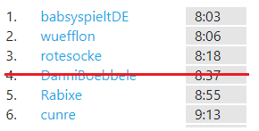 Teilnehmer #4 musste leider ausscheiden, da ich diesen mit dem angegebenen Namen nicht ingame finden kann. Dafür ist der 6. Platz mit reingerutscht.