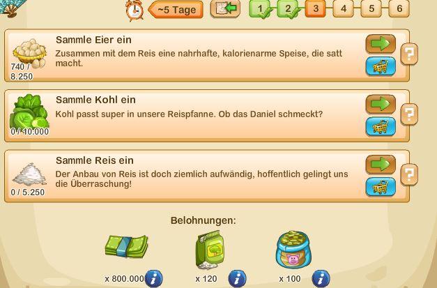 Aufgabe 3: 6700 Eier, 3340 Kohl, 1330 Reis sammeln. Belohnung: 430000 Dollar, 90 Dünger, 70 Schweinefutter