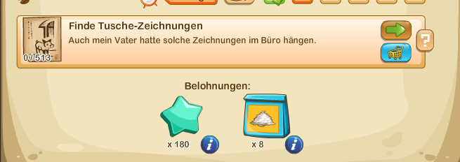 Aufgabe 1: 160 Dünger sammeln und 9x Äpfel starten. Belohnung: 5xReissaaten, 110 Premium Hühnerfutter.Aufgabe 2: 580 Tuschezeichnungen finden. Belohnung: 180 EP, 8xReissaaten