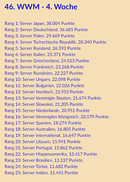 Was ich mich bei dieser WWM-Tabelle schon immer gefragt habe ist, wieso Japan immer knapp vor dem Deutschen Server DE1 liegt. Dabei ist es mir schon klar, dass es nicht direkt die Erfolge eines Servers bei der BüM sind.
