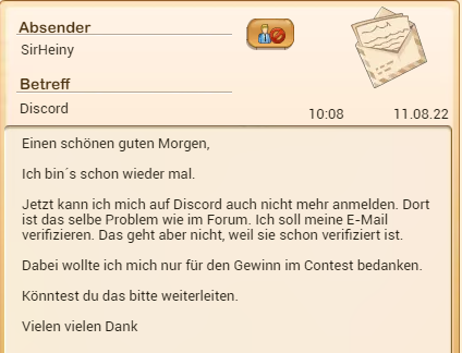 Hallo Gut Landluft,Gut Landluft (DE1) schrieb:ich hab wieder eine PN, diesmal bzgl. Einloggen in Discord: