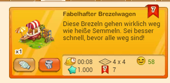 Den hübschen Brezelwagen gibt es beim Händler, da bin ich mir relativ sicher. Ich glaube auch, dass er für die kleineren Level als Fleißbelohnung zu haben ist, statt des fabelhaften Brezelwagens.