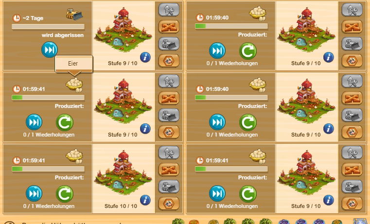 Da ich auch gerne wissen möchte, wie lange die Abrisszeit ist u. ich ebenfalls keinen Platz für die Herausnahme der Ställe habe, wär es toll, wenn man das ändern könnte. (Abrisszeit u. Anzeige der Menge).Für die fähigen Köpfe bei GG dürfte das doch kein Problem sein und wir, die Spieler, hätten ein kleines Zuckerl bekommen.