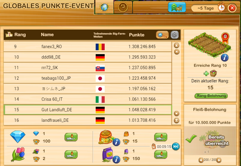 Ich habe noch nie beim globalen Event mitgemacht, weil es ein Ressourcenfresser ist und die Belohnungen in keinem Verhältnis zu den "Spenden" stehen. Die Platzierung in der Rangliste ist mir egal.