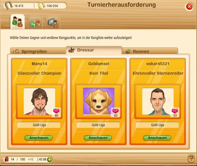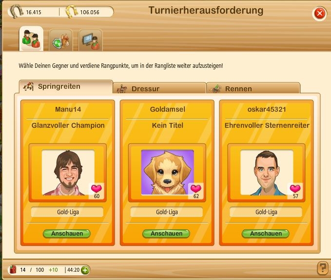 auch die Pferde hießen dann anders: beim Springreiten war es "Goldy" mit Level 57 und bei Dressur ein anderer Namen mit Level 53