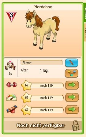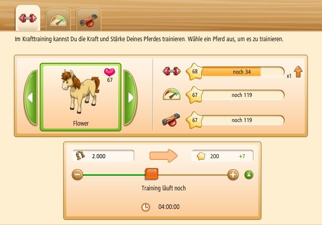 das 67iger Pferd ist jetzt nur noch 1,5 Level trainierbar, bevor das Intensivtraining anfängt: dann hab ich 2000 Hufeisen ausgegeben