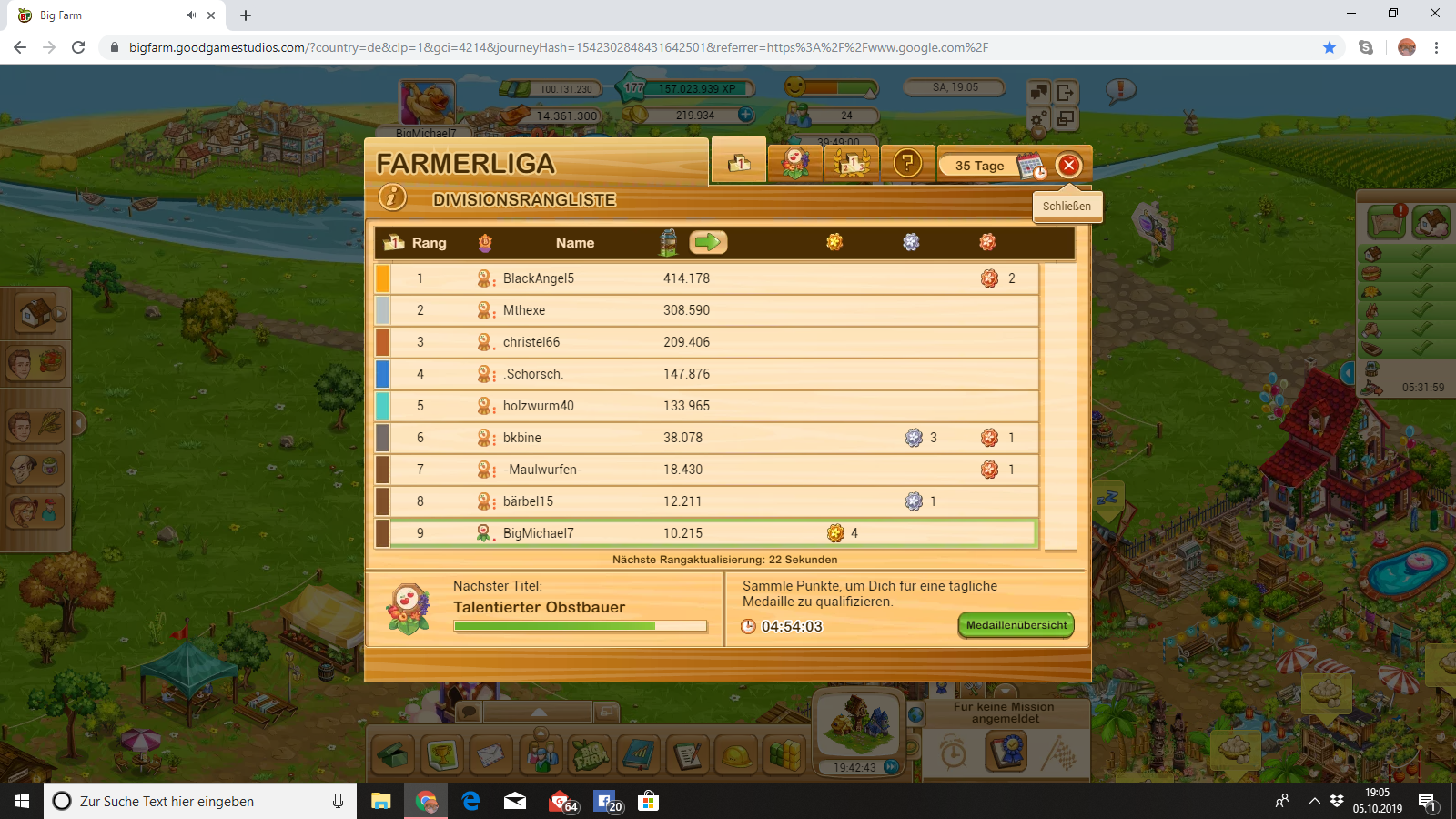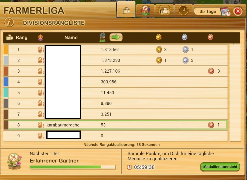 Da ich mit 1,3 Millionen Punkte führend war, hat's mich auch kurz in Versuchung geführt, nichts zu ernten, um zu sehen, ob daraus eine Goldmedaille wird. Aber Bugusing ist nicht so mein Ding, deshalb *klick* aufs Maisfeld. :wink: