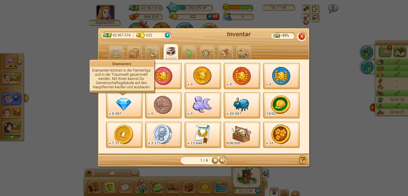 1500 Diamanten am Ende des Fleißevents + 5500 Diamanten für Beendigung Farmerliga erhalten, macht nach Adam Riese 7000 Diamanten. Im Inventar sind 6097 Diamanten, wie