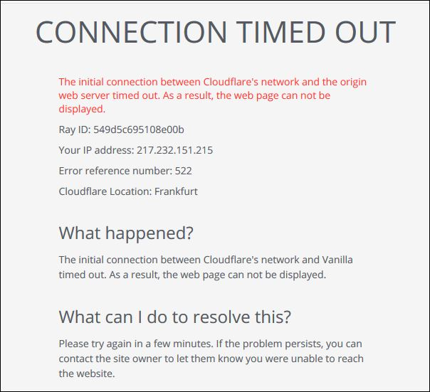 The initial connection between Cloudflare's network and Vanilla timed out. As a result, the web page can not be displayed.
