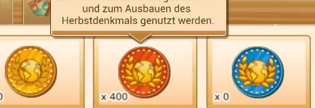 Ich verstehe gar nichts mehr. In der ML gab es Herbstmünzen statt Wintermünzen. Okay. Mein Herbstdenkmal konnte ich allerdings nicht weiter ausbauen, denn da wurden die gewonnenen Münzen nicht angezeigt, bzw. ich kann es gar nicht öffnen