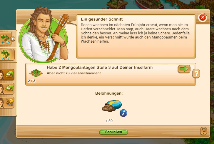 Aufgabe: Besitze 2 Mangoplantagen Stufe 3