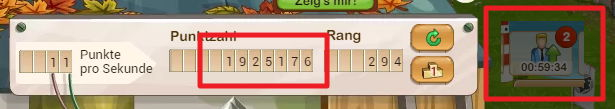 Mein Trichter läuft mit 11 Punkten/Sekunde. Schalte ich einen 25%-Booster und beobachte den Punktezähler im Turm, scheint dieser korrekt zu zählen. Satt +11 Punkte bekomme ich +13 bzw. +14 Punkte dazu. So weit, so gut und richtig.