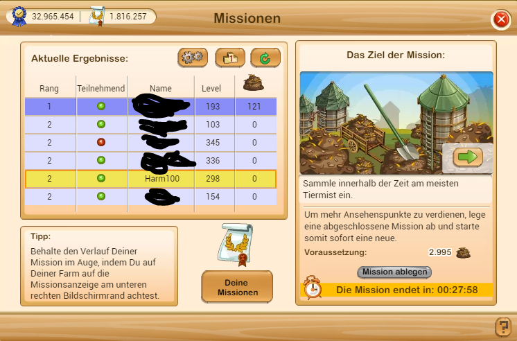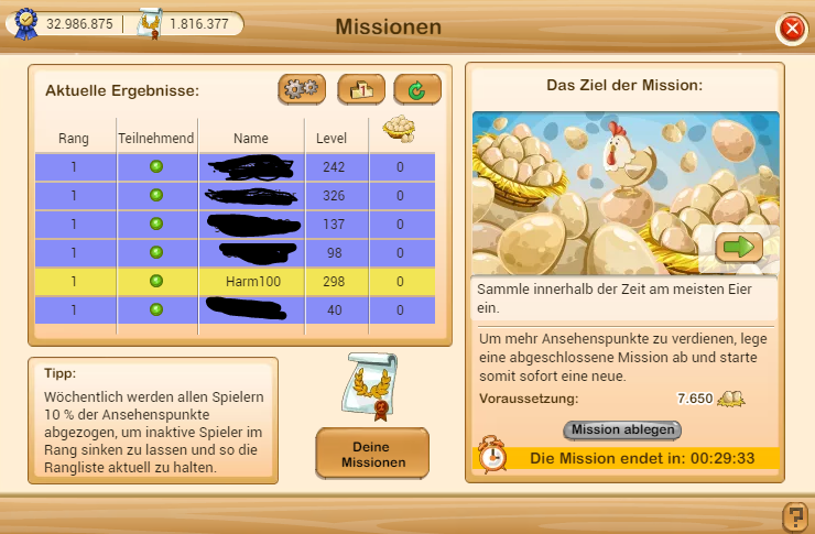 Gute Nachricht von mir: Die Eier-Anforderung hat sich seit heute normalisiert. Mist scheint mir zwar immer noch höher als früher, ist aber immerhin um ca. 1100 zurückgegangen. Baue jetzt allerdings den gewonnenen Ländlichen Hühnerstall auf, hoffentlich bringt der jetzt nicht wieder alles durcheinander...