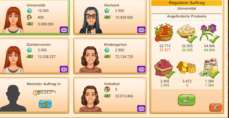Klar es gibt auch noch andere Waren, die mal in den Aufträgen vorkommen sollten. Aber wie am o.g. Auftrag von Landgut zu sehen ist, reisst sich nmd um Aufträge mit ellenlangen Laufzeiten für die geforderten Waren. Ich habe 1x einen Auftrag mit über 3.500 Krischmarmelade angenommen und dann wochenlang daran rumgewerkelt bis ich ihn endlich erfüllen konnte. Dafür musste ich dann die parallel angebotenen Aufträge mit Kirschen kicken damit es nicht noch länger dauerte. Deshalb werde ich Aufträge mit Marmeladen nur noch annehmen wenn ich die Marmeladenmenge am Lager habe.