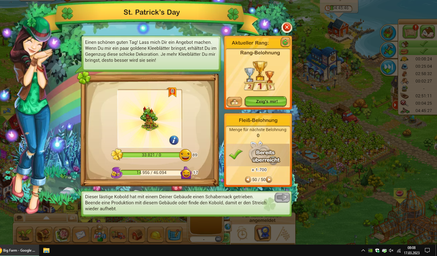 Ich bezog mich da auf Level der Farm und Anzahl der Kleeblätter- die man sammeln soll/muss- ich musste für eine Zufriedenheit von 89 weniger erbringen als du- das war mein Gedanke- aber du hast es ja dann geklärt-Gut Landluft (DE1) schrieb:wieso am Level der Farm? samos?