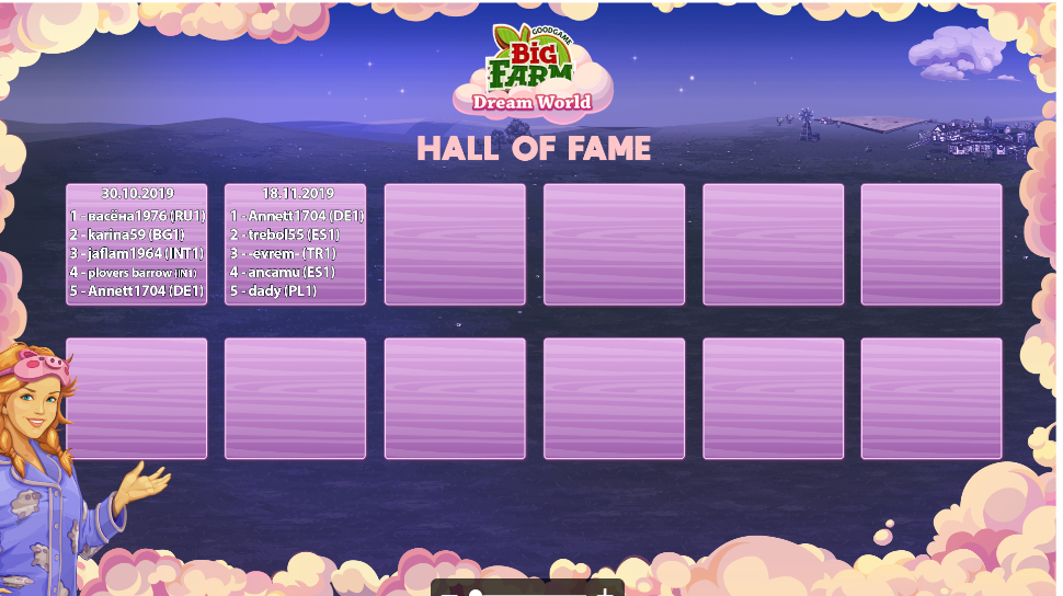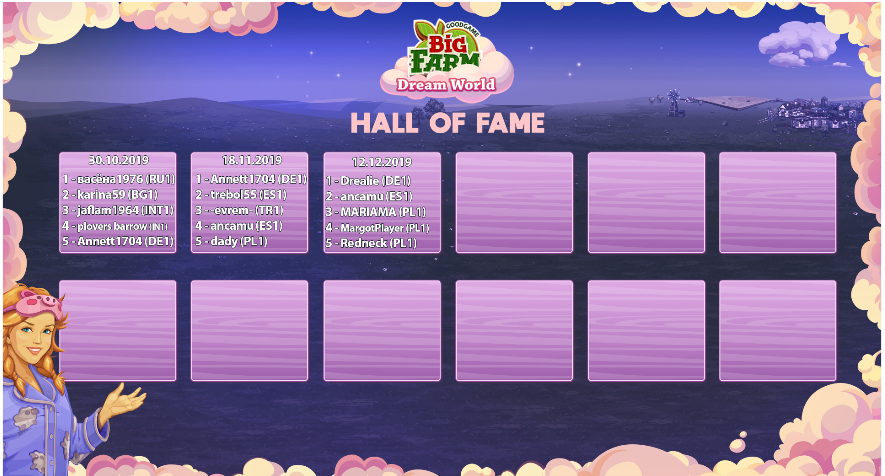 από τώρα και στο εξής θα προσφέρουμε τις βαθμολογίες του Hall of Fame για την εκδήλωση του Dream World. Μετά το τέλος της εκδήλωσης, οι 5 πρώτοι παίκτες θα εμφανιστούν στην κατάταξη. με αυτόν τον τρόπο