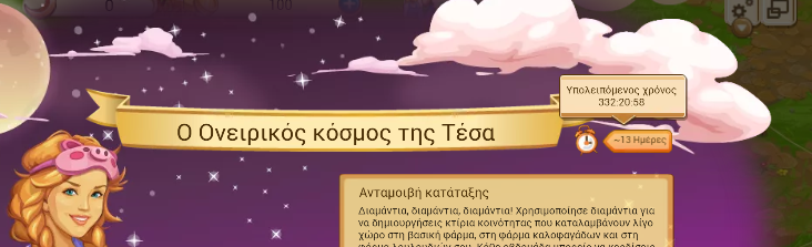 Υπάρχει χρονόμετρο αντίστροφης μέτρησης και στον DWΟ χρήστης Greek goddes (GR1) είπε:βλεπω οτι η φαρμα ζαχαρωτων θα ειναι εργη για 1 μηνα αλλα δεν βλεπω ρολοι στη ονειρικη φαρμα αν ειναι event δεν πρεπει και αυτο να τελειωνει ?