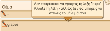 Δεν καταλαβαινω το λογο που δεν μου επιτρεπεται να γραψω τη λεξη "grapes" στα μηνυματα μου. Πως αλιως λεγονται τα σταφυλια στα Αγγλικα; Πως να εξηγησω στη συμπαικτρια μου τι να φυτεψει στο νησι των ζαχαρωτων; Ας μην ειχαμε σταφυλια τοτε αφου απαγορευεται να τα γραψουμε. Σας παρακαλω, μπορειτε να μεσολαβησετε να διορθωθει; Ευχαριστω.