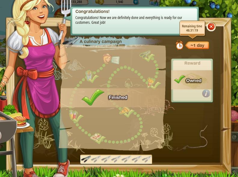 I have only 5 fields in my GF, and kept everything churning, and I was able to finish level 3 without using gold. It was an absolute nightmare in terms of time invested, so it can be done, but as I posted above, I won't be doing it again. I used the drop rate chart from CrazyBigFarms' site for other events, and that seemed to work the best.archerbob (AU1) said:Well currently I am level 86 and my gourmet farm looks like the following. I am stumped as how you can complete this event with the farm you have pictured at the bottom of your post. Clearly this game is bugged for some people such as myself and not for others such as you!qewt (US1) said:Ive completed this event before at difficulty 3, it forced me to do difficulty 3 again with no option to choose.Surya54 (INT1) said:Try to do your best! You just need to complete once and you can choose the difficulty.archerbob (AU1) said:Onto step 5, spent some game cash and now onto step 6 with 47 hours to go...