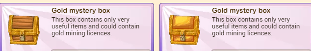 I too prefer the wood colored gold mystery boxes, but if those are out of the question, then the second best is the golden colored gold mystery boxes. Those gold colored boxes generally have the same type of stuff but lesser quantity than what the wood colored gold mystery boxes. The Silver Mystery boxes totally lack the gold mining licenses and the goldflower seed. I definitely would rather have goldflower seeds rather than sunflower seeds.