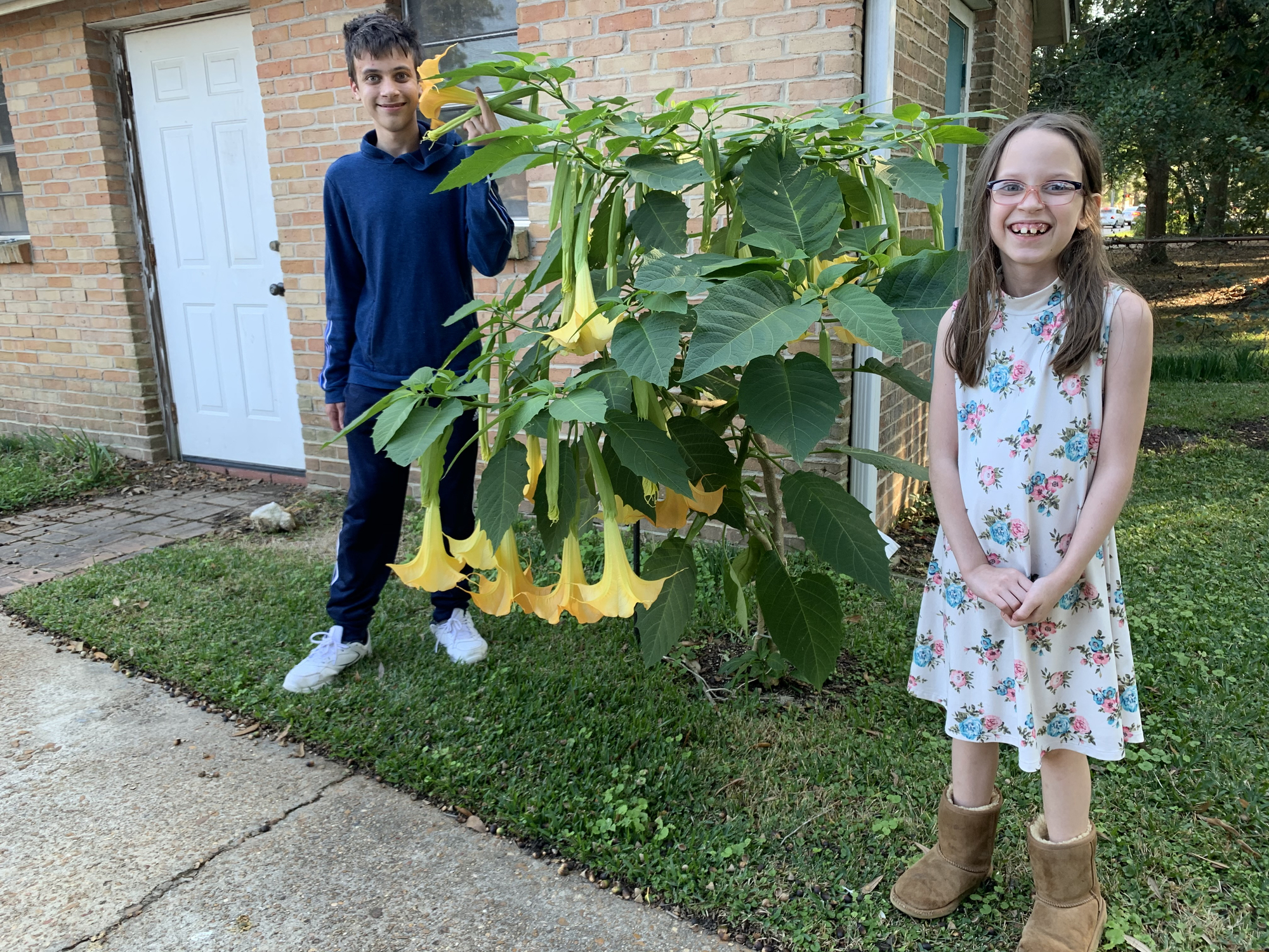 This is what one actually looks like. The flowers are huge, about 7-8 inches long. They hang for 3-4 days. It only blooms at then end of the season, around October (depending on where you live and temperatures). It grows like a weed, absurdly fast. In about 3-4 weeks, I will cut it off just above ground, and it will be much bigger next year. I actually only planted this one in August. The one in the front yard is much. much bigger, but it has not yet bloomed. There are over 20 on this one and about 30 waiting to open.