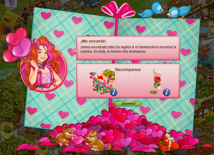 porqueriza: 8 - 12 regalos romántic vaqueriza: 25 - 36 regalos románticos gallinero: 3 - 5 regalos románticos Si consigues recoger todos los regalos románticos, obtendrás una bandera y una decoración muy bonita como recompensa por tu esfuerzo: |