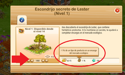En este caso, se trata de elegir un producto en el contrato que nos interese que Lester nos ayude. Por cada nivel que hayamos subido el escondrijo, Lester nos descontará un 1 % del producto de ese pedido. Es decir: si tenemos el escondrijo de Lester a nivel 1, nos descontará un 1%. Si lo tenemos a nivel 2, nos descontará un 2 %. Si lo tenemos a nivel 3, nos descontará un 3 % y así sucesivamente hasta que lo tengamos al nivel 80, que sería su nivel máximo.