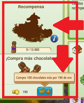 A medida que avances en la recogida de chocolates, la silueta de la decoración se irá rellenando para que veas tu progreso y si en algún momento necesitas ayuda y quieres comprar chocolates, puedes hacerlo, usando oros: 100 chocolates equivalen a 190 oros (ver imagen inferior).