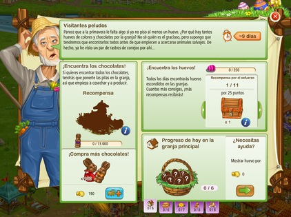 La segunda parte del evento consiste en encontrar huevos de Pascua escondidos en los alrededores de tus granjas. Son un total de 350 huevos y aparecen 35 cada día durante los 10 días de duración de este evento. Según vayas encontrando los huevos, recibirás unos pequeños regalos como recompensa hasta que llegues al final del evento: