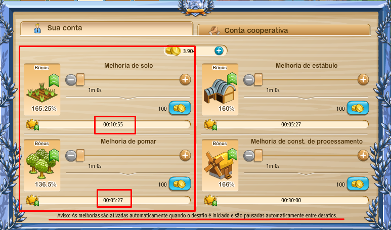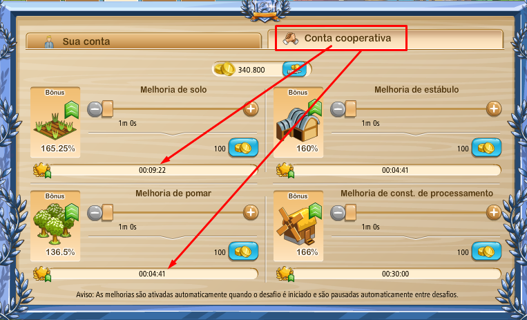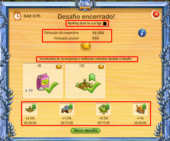Como ya he visto los desafíos del tiempo puede ser muy variada y en función de la liga en la que se inserta nuestra cooperativa. Pueden existir granjas de arriba con 3 estrellas en un desafío y 30 minutos de duración en la aleación de bronce, por ejemplo.