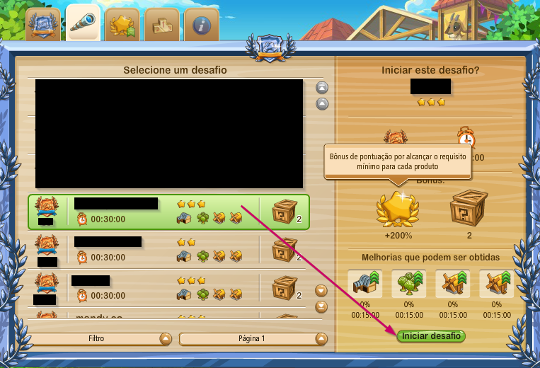Elegido el desafío y verificadas las ventajas, tiempo de duración, recompensas y bonos de puntuación de producción, número de ítems de ayuda y tipo de ítems de granja, se da el puntapié de salida: