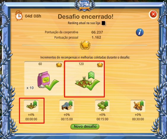 Cuando el desafío termina se muestra esta pantalla con la información general de lo que fue ganado por la coop e individualmente así como el impulsor que fue recibido y que va a estar activo en el próximo desafío que tenga productos de suelo.
