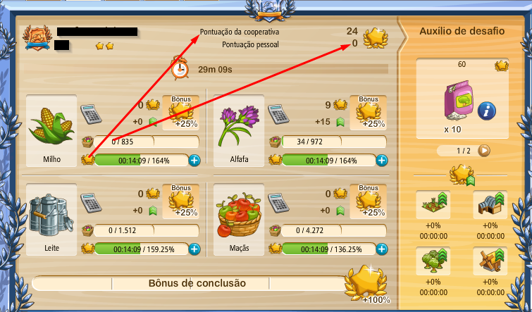 Recuerde, sin embargo, una vez que un desafío se inicia no puede ser terminado antes de que su tiempo se agote. No se preocupe demasiado, si usted no consigue cosechar todos los productos y, a causa de eso, no obtener puntos de bonificación por completar el desafío, acaba siempre por obtener algunas recompensas ocasionales, si está en curso algún desafío en el coop mientras usted se ocupa de su granja diariamente.