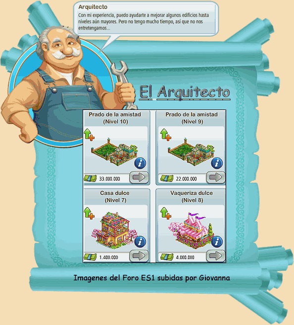 Nota: Los edificios que muestran los precios en negro y azul es porque su coste inicial es en dólares pero algunas de sus mejoras son en oro.