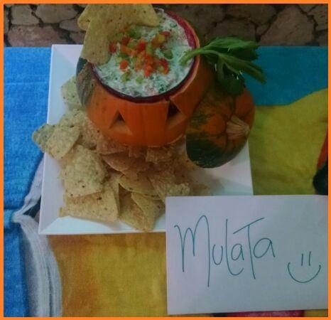 Tomamos la calabaza y la tallamos haciendo los ojos y la boca con un cuchillo, abrimos la parte superior de tal manera que nos quepa un bol pequeño para servir nuestro dip y sacamos el relleno, guardamos la parte de arriba a manera de "tapa"