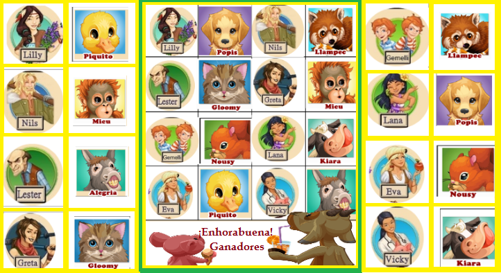 Saphire5 dijo:Los Ganadores son:Vicky-Kiara SIEva-Piquito NOLana-LLamper NOLester-Alegria SILilly-Popis NOGemelli-Micu NONils-Nousy SIGreta-Gloomy SIyolanda121 @ es 1_________________________________________________________Lana-Popis siLilly-Micu noVicky-Kiara SIEva-Piquito NONils-Nousy NOGreta-Gloomy SIGemelos-Llampec SILester-Alegria SIaonaon @ es 1________________________________________________________LILLY - PUIQUITO SILESTER - LlAMPEC NOGEMELLI - MICU NOEVA - NOUSY SINILS - ALEGRIA NOGRETA - GLOOMY SILANA - POPIS SIVICKY - KIARA SI___________________________________________________Lilly - Nousy NOEva - Piquito NOGemelos - Alegría NOLana - Popis SINils - Micu SIGreta - Gloomy SILester - Llampec NOVicky - Kiara SIEridania.G (HIS1)