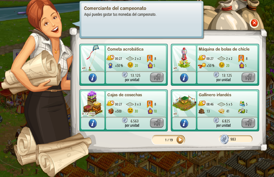 Llegó a nuestras granjas el comerciante del campeonato en su camioneta amarilla. Se quedará hasta el final del evento y si clicáis su icono, podéis ver qué ofertas podéis comprar con las monedas ganadas en el campeonato.