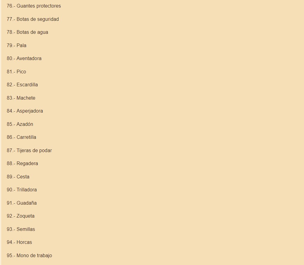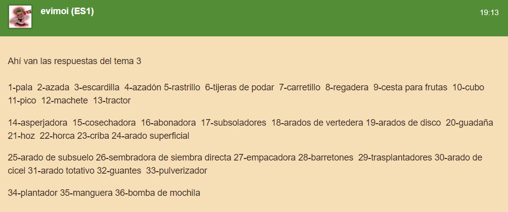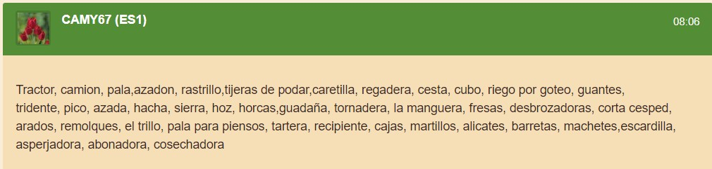 Por 1 punto, por respuesta acertada, deben decirme herramientas y utensilios de agricultor (No existe para este tema un máximo de palabras, no valdrán cambios de color o tamaño, ni marcas publicitarias y si escribes el genérico no valdrán los diferentes modelos), como, por ejemplo, un tractor.