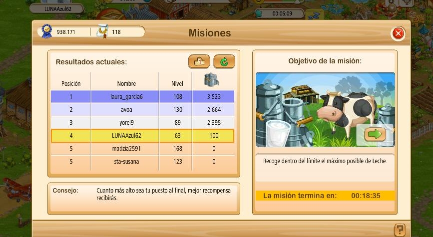 Como información yo si realicé un pantallazo de una misión y los níveles...a mí personalmente me siguen pareciendo un poco desorbitados la diferencia. Yo ahí toda pequeñita entre todos esos grandotes, claro me dieron "sopa con ondas" más que nada también que las vacas tardan muchas horas en salir, y tiene que dar la casualidad de tener en ese momento que recoger la leche, o simplemente de hacer con "pienso veloz" no salen 3.523 de leche (como se puede apreciar en la imagen faltaban 18:35 para terminar).