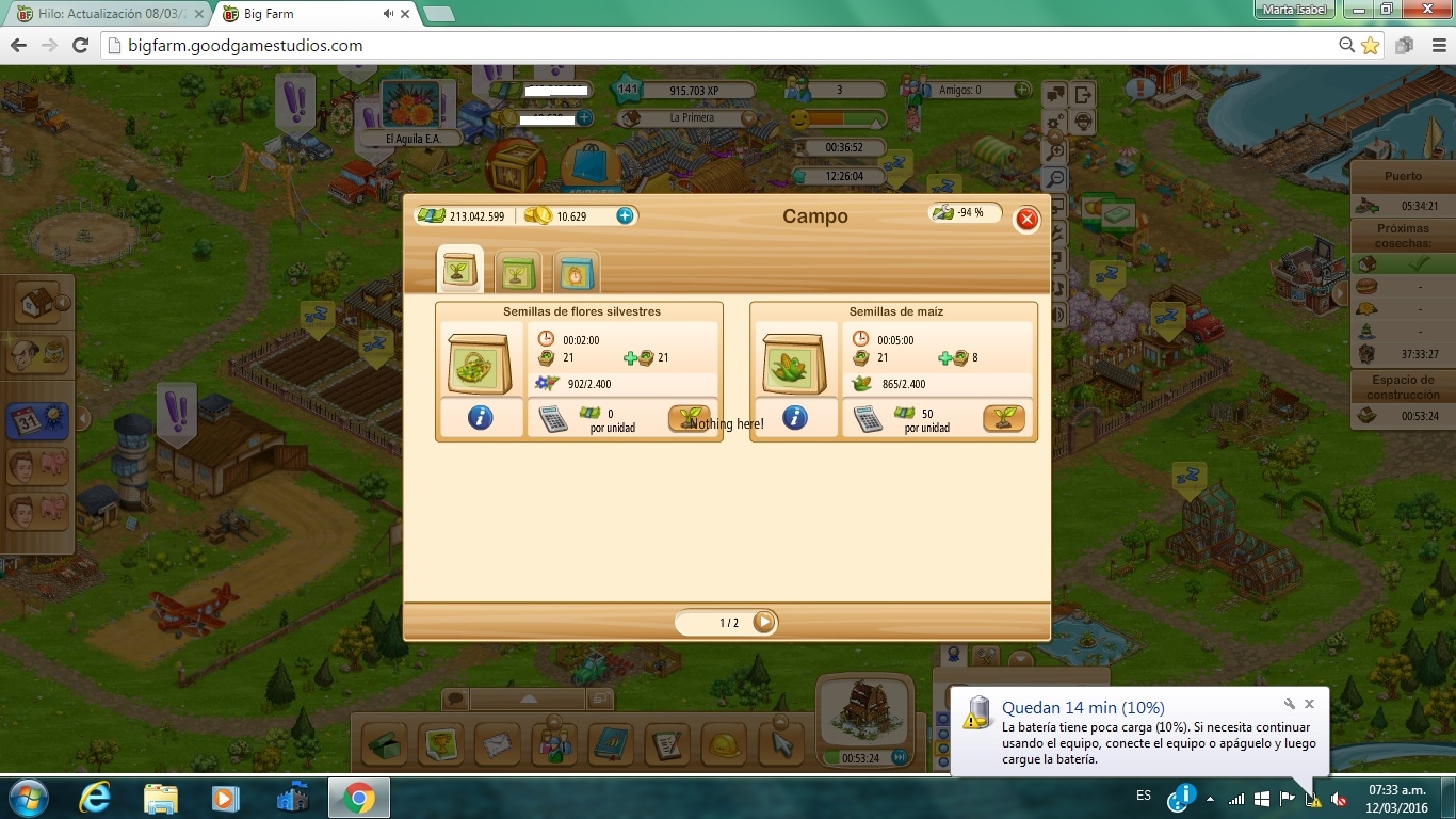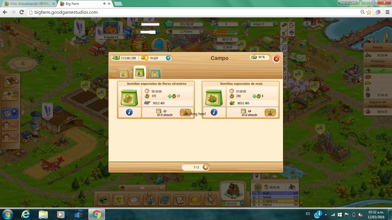 Empece una misión, pues se me trabo el juego, recoger nabos, los plante sin problemas y cuando a fui a recoger la primera tanda. Recogía una campo, me lo daba pero pero quedaba velado y igual que el resto de los campos a los que iba dando click en sucesión, no es raro, a veces cuando esta por salir un tipo con burbuja suele pasar... pero ahora no pasaba eso tuve que cambiar de granja para despejar, pero me estaba pasando lo mismo con cada campo. Cerre el juego limpie el historial, borre cockies, ect.,ect., igual se seguia trabando. Finalmente libere los campos y me encuentro, que veo que no soy la unica a la que le pasa, no encuentro las semillas.