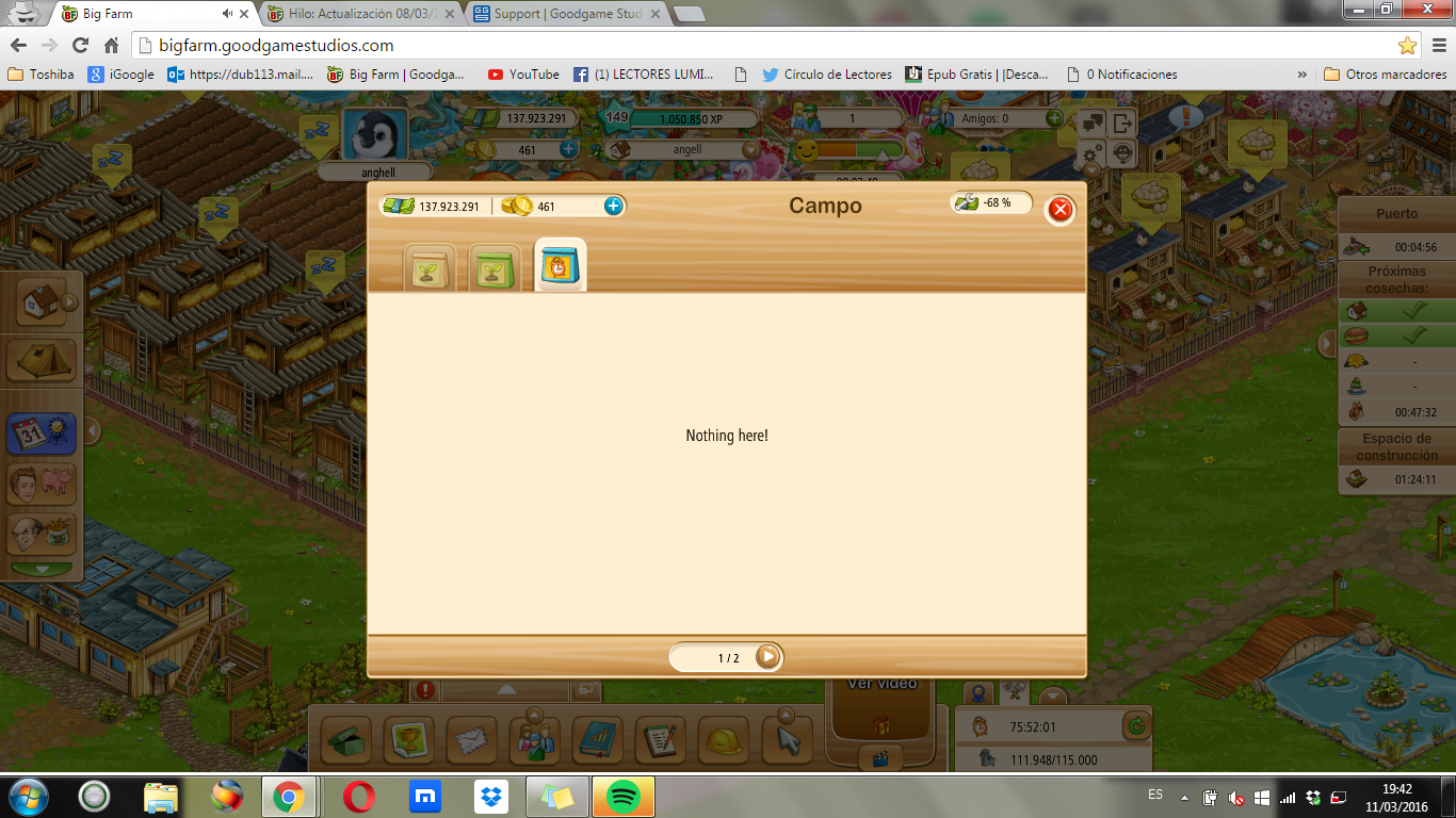 tengo este mismo problema en mi granjaanghell (ES1) dijo:me uno al grupo que tiene la granja clavada.sin semillas de vivero, pone nothing here, y no em deja senbrar, perdere el evento, la paciencia, y la alegria d elas semillas,no me digas por fa po , que reinciie la pagina, borre cookies y caxes por fa que eso esta hecho, PORQUE Se hacen actualixacione slos vierne spor la tarde que se van todo s d efinde, cada vez que recojo un campo debo cambiar de granja prara poder sembrar, se clacva, muy mal como siempre, decepcion , adjunto imagen y he mandado queja asoporte. en mi empresa ya estarian en la lista del paro