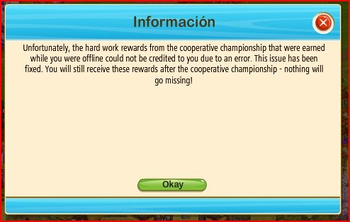 Traducción: Desafortunadamente, las recompensas por el duro trabajo en el campeonato de cooperativas que fueron ganadas mientras estuviste "desconectado" no te podran ser entregadas debido a un error. Este error ha sido solucionado. Recibiras esas recompensas después del campeonato de cooperativas - nada se perderá!