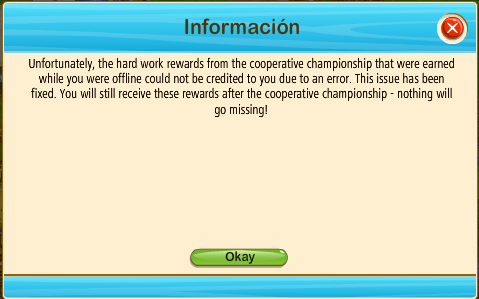 "Desafortunadamente, las recompensas por el esfuerzo del Campeonato de Cooperativas conseguidas mientras se estaba desconectado no han sido acreditadas correctamente debido a un error en el juego. El error ha sido corregido. Una vez termine el evento del Campeonato de Cooperativas recibirás estas recompensas - no se perderán!"