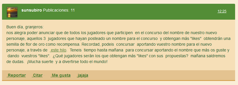 no olvidéis que es en este hilo donde podéis concursar enviándonos un nombre para nuestro nuevo personaje de Big Farm. Proponed un nombre y dadle un "like" al nombre propuesto que os guste más, y los tres concursantes que obtengan más "likes" con su nombre propuesto, ganarán una semilla de flor de oro. ¡Vamos granjeros, no perdáis esta oportunidad de participar y ganar un premio!