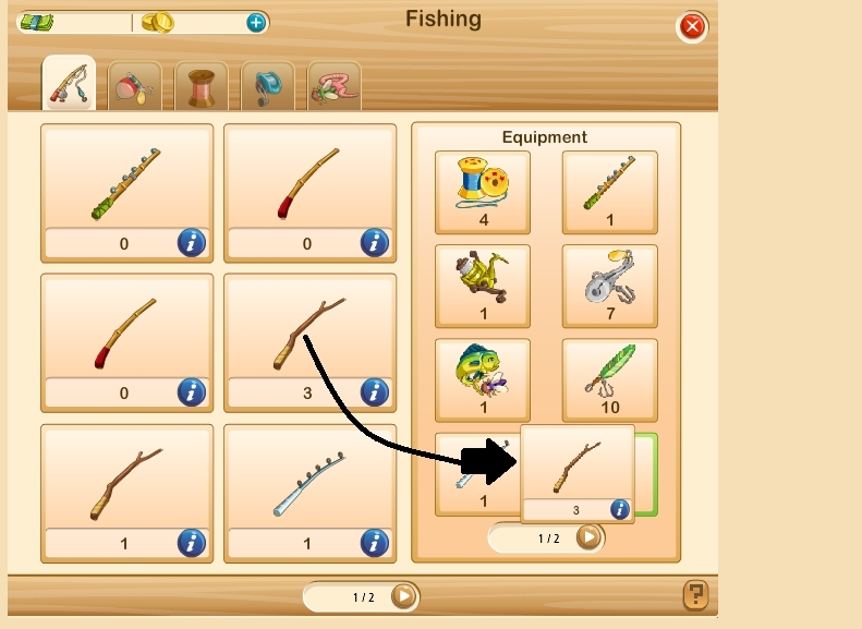 En la tienda de engranaje, podrás comprar el equipo de pesca, tales como postes, carretes, señuelos y Líneas.